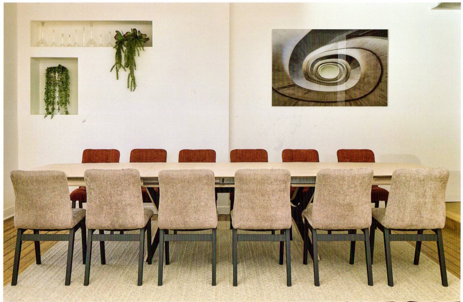 Avec cet ensemble des chaises colorées ( rouge brique, jaune, taupe et gris foncé)sont du plus bel effet.