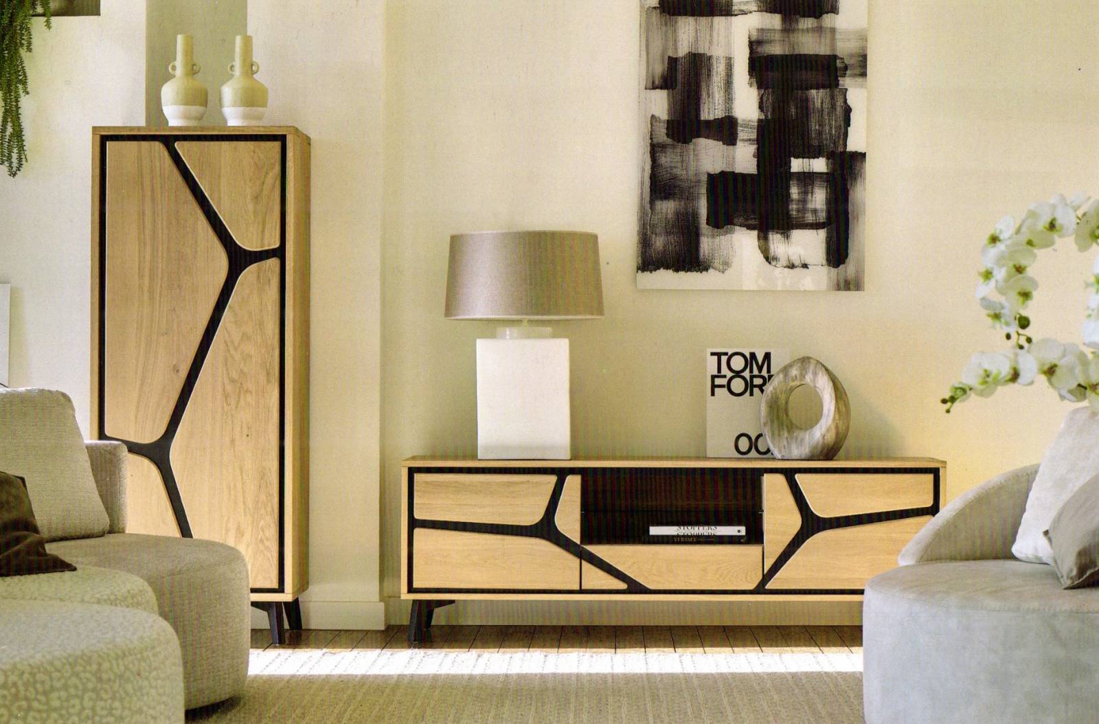 Colonne avec porte haute vitrée, meuble TV en 140 cm et 180 cm , table basse de salon carrée en 95 cm x 95 cm , rectangle de 120 x 65 cm. Meuble d'appui, meuble d'entrée avec ou sans tiroir.