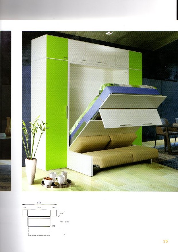 les coussins du canapé sont couleur'Grès '; petit canapé sympa qui se replie automatiquement sous le lit, sans effort de votre part. Nous avons aussi une table pliante en salon ou salle à manger, qui se retrouvera sous le lit avec le canapé.